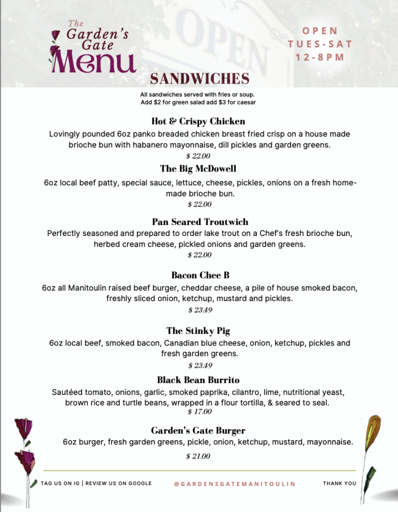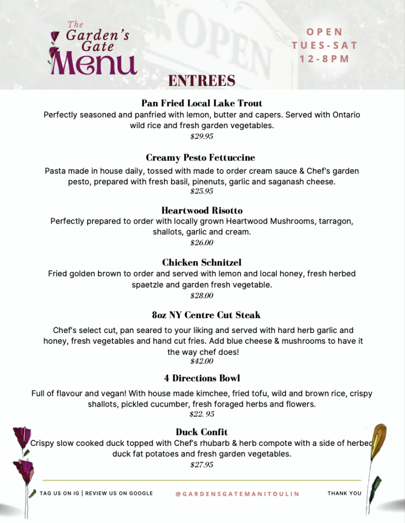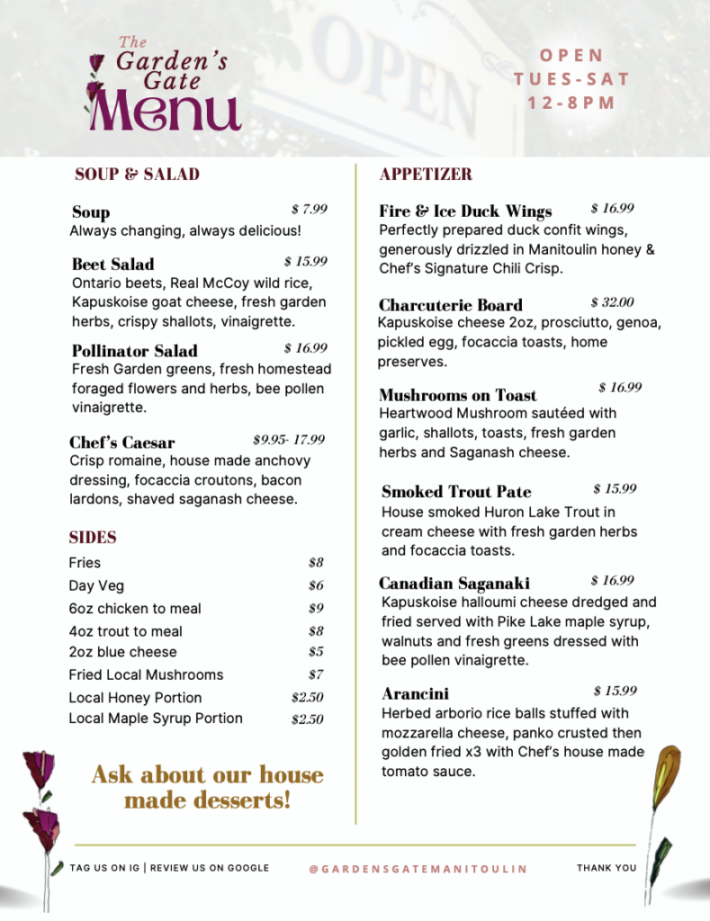 At The Garden’s Gate Restaurant in Tehkummah, we craft a fresh, seasonal menu inspired by the land we’re rooted in. From handmade pasta and vibrant garden-grown greens to house-made dressings, nourishing vegan soups, and decadent desserts—every dish is created with care by our small, passionate team.